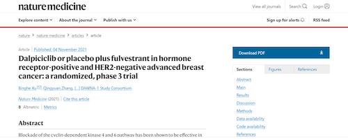 11月4日,国际四大医学期刊之一、英国《自然》旗下《自然医学》(Nature Medicine)在线发表CDK4/6抑制剂达尔西利(SHR6390)联合氟维司群治疗既往内分泌治疗后疾病进展的HR+/HER2-晚期乳腺癌的多中心、随机、双盲III期临床研究(DAWNA-1研究)中期分析结果报告,首次对氟维司群(雌激素受体降解剂)±达尔西利治疗激素受体阳性晚期乳腺癌的有效性和安全性进行了比较。研究结果显示,达尔西利+氟维司群组与安慰剂+氟维司群组相比,无进展生存期(PFS)显著延长。该项研究由中国医学科学院肿瘤医院徐兵河教授担任leading PI,全国39家医院参研,由利来国际医药临床研发团队支持完成。